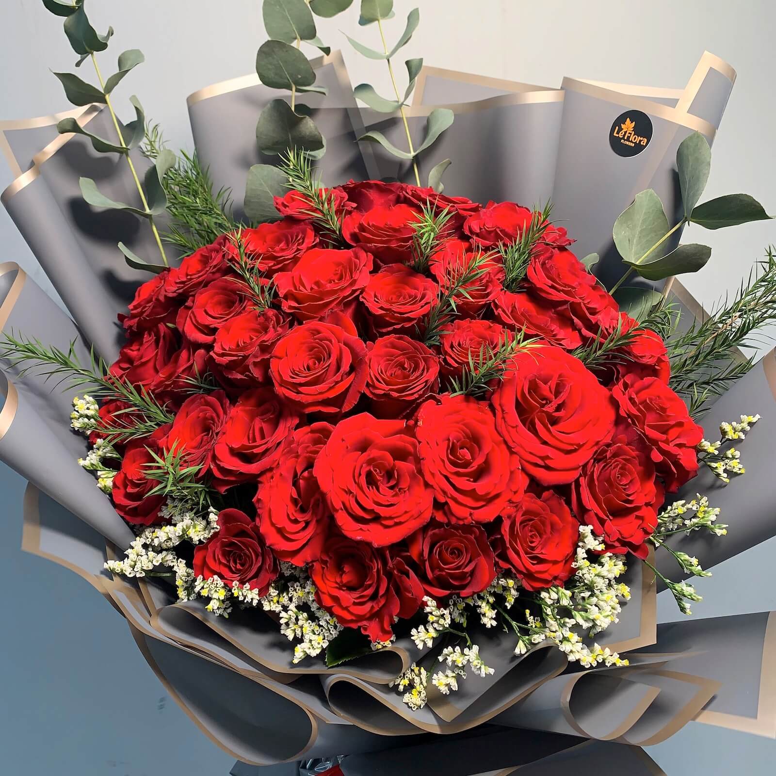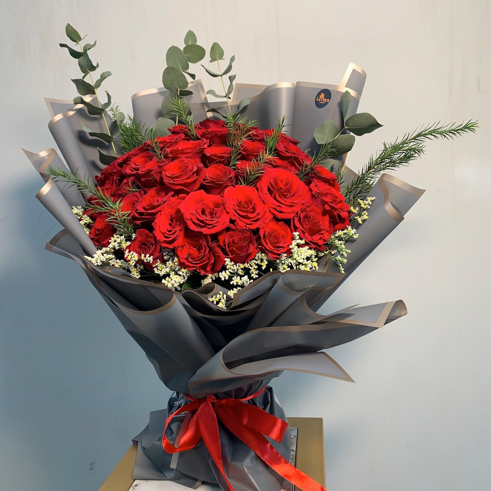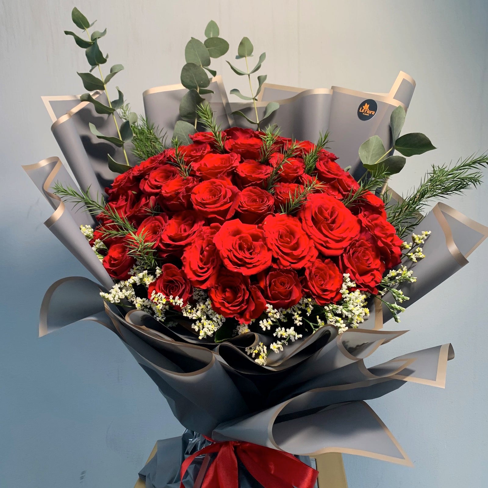 A stunningly beautiful bouquet with 45 pcs red roses and Fillers.